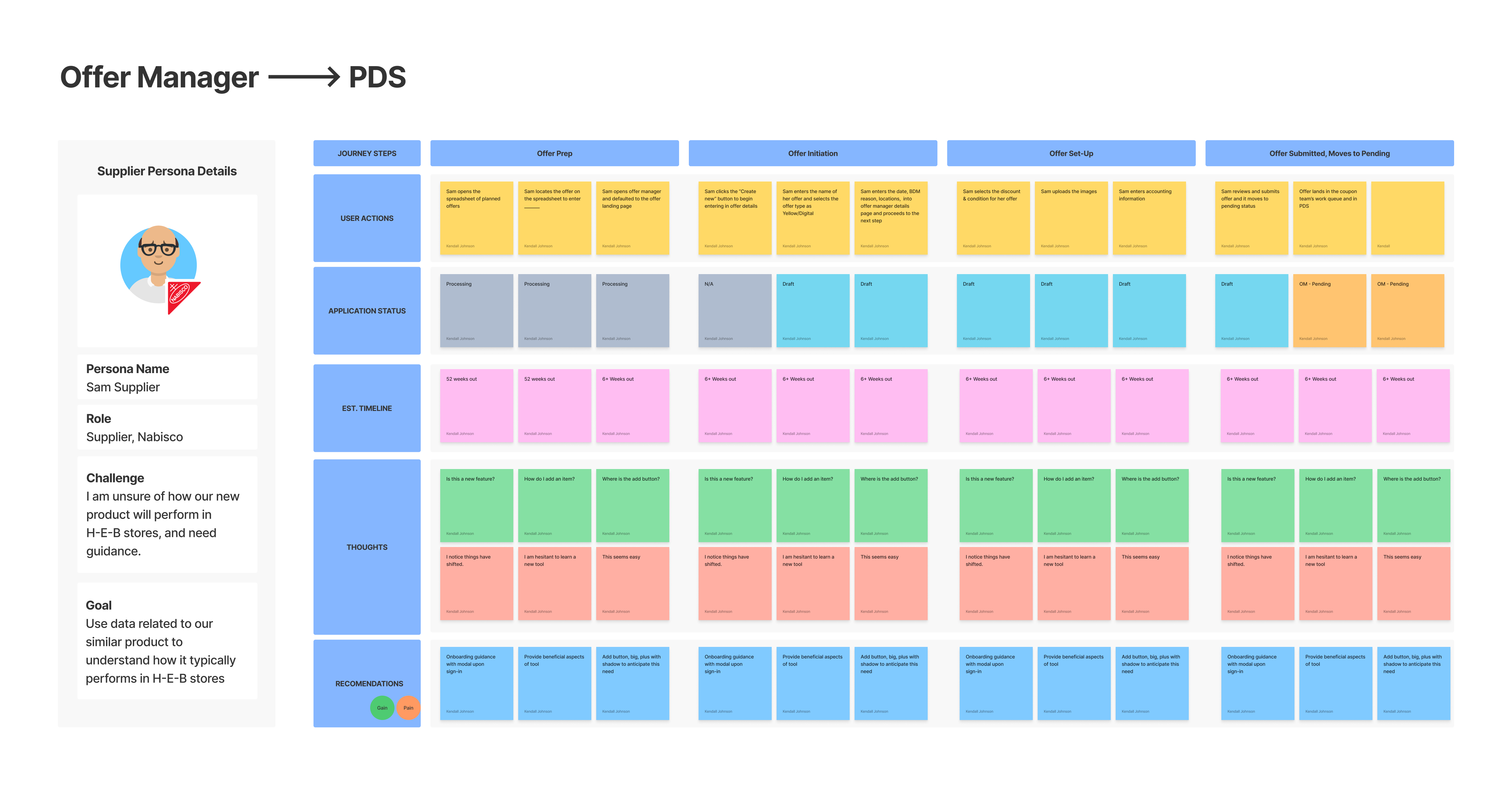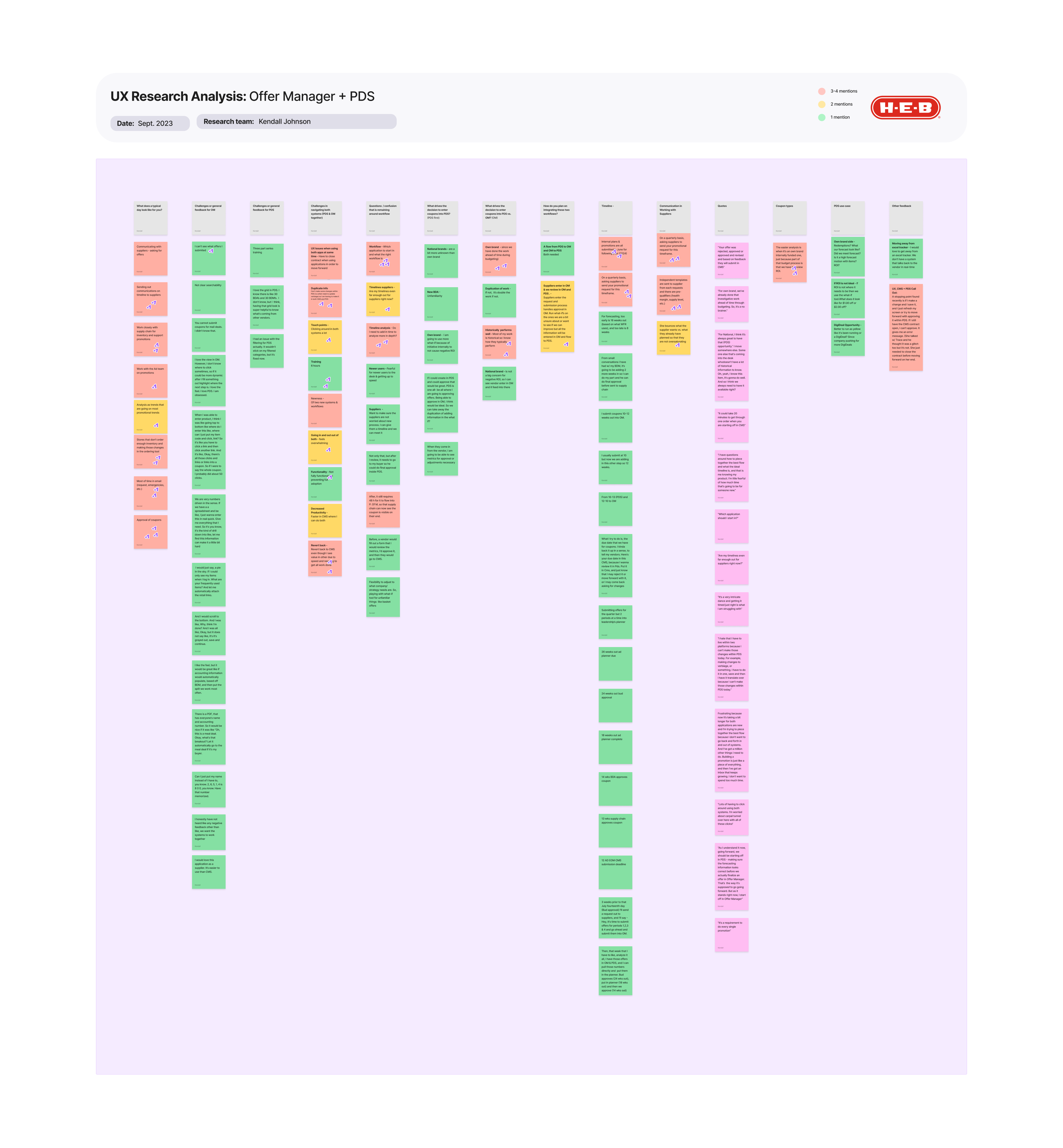 I ground the project in real user needs, I conducted in-depth interviews with H-E-B Business Development Analysts (BDAs), Business Development Managers (BDMs), and supplier partners. These conversations revealed confusion around timelines, fragmented workflows across systems, and a lack of clarity around where to begin the offer creation process. This research informed our initial problem framing and directly shaped early design decisions.